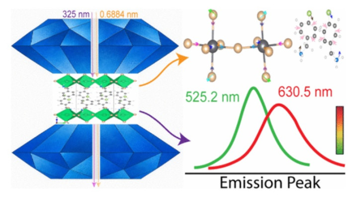 We present a systematic high-pressure investigation of the chlorine-functionalized two-dimensional hybrid perovskite (ClPMA)2PbI4, integrating in situ high-pressure synchrotron powder X-ray diffraction (HP-PXRD), photoluminescence spectroscopy (HP-PL), and first-principles density functional theory (DFT) calculations. Under hydrostatic compression up to 6.18 (±0.42) GPa, HP-PXRD reveals anisotropic lattice contraction (Δa/a0 = 4.06%, Δb/b0 = 3.00%, Δc/c0 = 8.66%) with a bulk modulus of 16.8 (±1.5) GPa (K0 = 34.1 TPa–1) and the onset of amorphization near 6.18 (±0.42) GPa. DFT-optimized structures corroborate progressive PbI6 octahedral flattening leading to reduced interlayer spacing and enhanced Cl···I, Cl···H, and I···H interactions. The full elastic tensor indicates moderate anisotropy (AE = 2.1, AG = 2.63) yet large Poisson’s ratios (−0.196 to 0.67), unveiling coexisting auxetic and elastic deformation pathways. HP-PL spectra exhibit a continuous red shift from 525.2 nm to ∼630.5 nm and intensity quenching, attributable to bond-contraction-induced bandgap narrowing and pressure-enhanced nonradiative recombination in the partially amorphous matrix. DFT band-structure calculations confirmed the pressure-dependent direct-gap evolution and maintaining k-space valence-band maximum and conduction-band minimum alignment. These findings elucidate the structural, mechanical, and optoelectronic tunability of (ClPMA)2PbI4, underscoring its promise for strain-engineered optoelectronic devices.